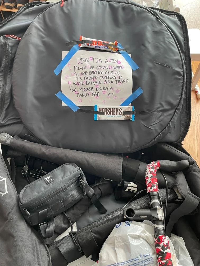 I borrowed a Post Carry Transfer bag (thanks Sky) for my ritchey instead of putting in it’s own travel case. The breakaway case works, but its a super tight fit. The case was designed to avoid luggage fees. Now that Alaska only charges a sporting good fee I wanted to try a different bag with more space. Usually upon building my bike after its been handled by TSA and bad throwers the wheels are out of true and theres scratches and gouges out of my frames and crankset. The Post Carry case was awesome. You gotta take off the fork, which is a little pain in the ass. More so cause your hands get mad greasy. I was super happy with the bag and my front wheel only need a minor adjustment. A+ bag Post Carry.